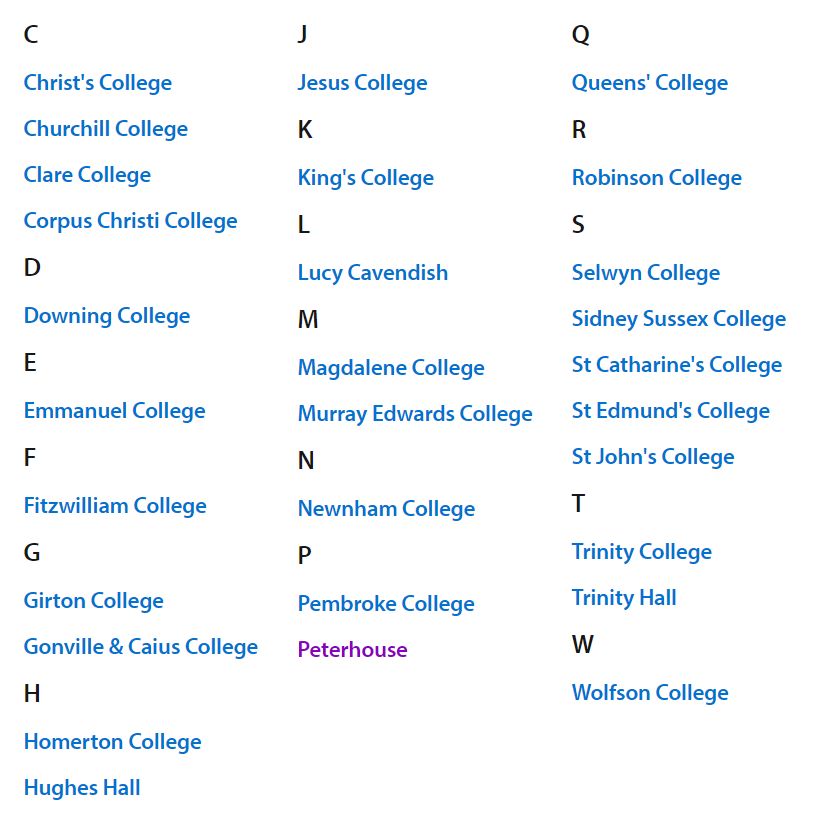 这里只展示了剑桥大学本科部分的相关学院。